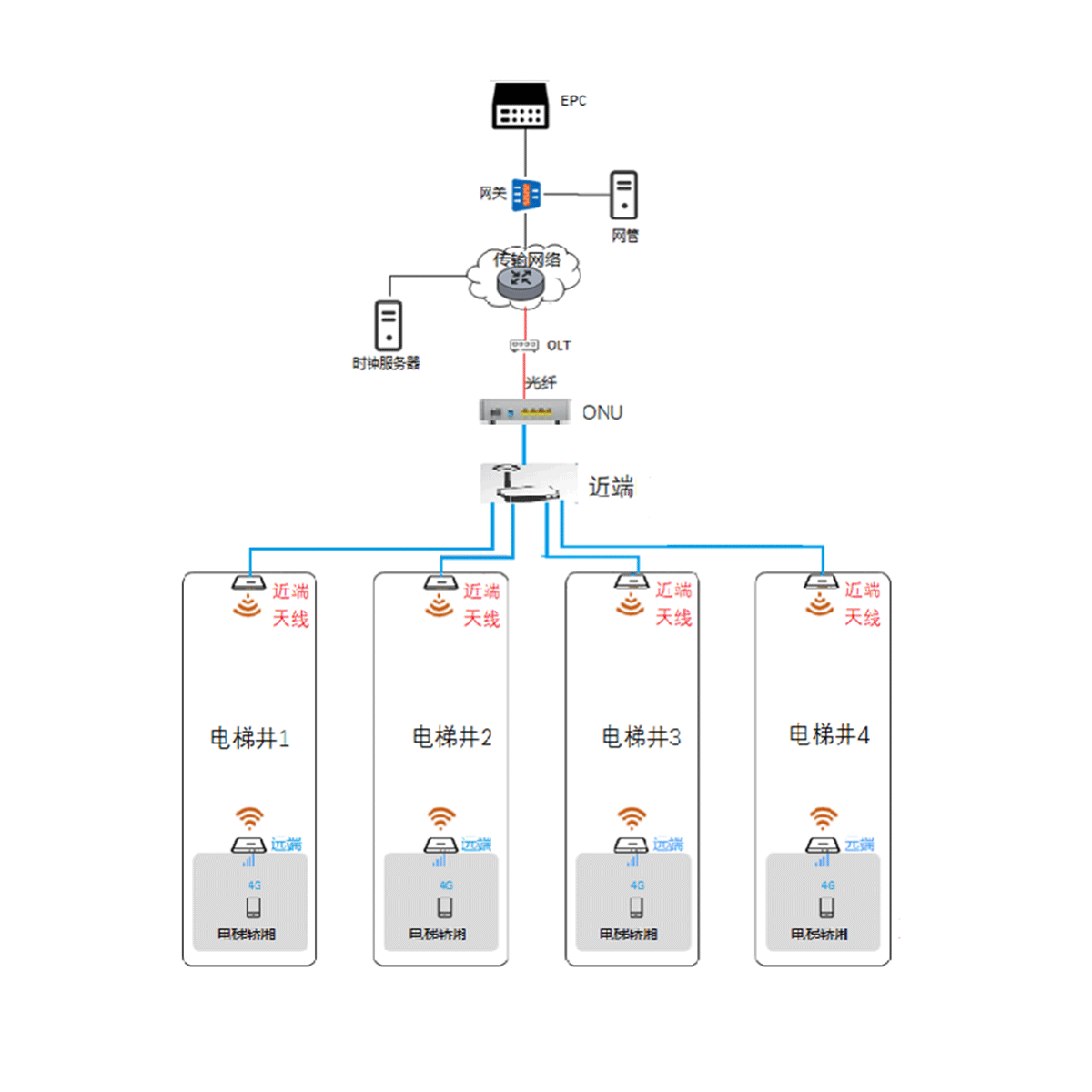 By installing a pair of 5GHz WiFi antennas at the top of the elevator shaft to cover the elevator shaft. It can support Ethernet expansion to achieve a one-to-four networking configuration, covering four elevators. The near end integrates a 5GHz WiFi bridge and router with ONU (optional) function.